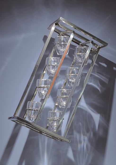 5 항해를 위한 8개의 흘림 방지 유리잔 세트(1934년). 크롬 도금한 황동과 크리스털. 에르메스 크리에이션 아카이브.