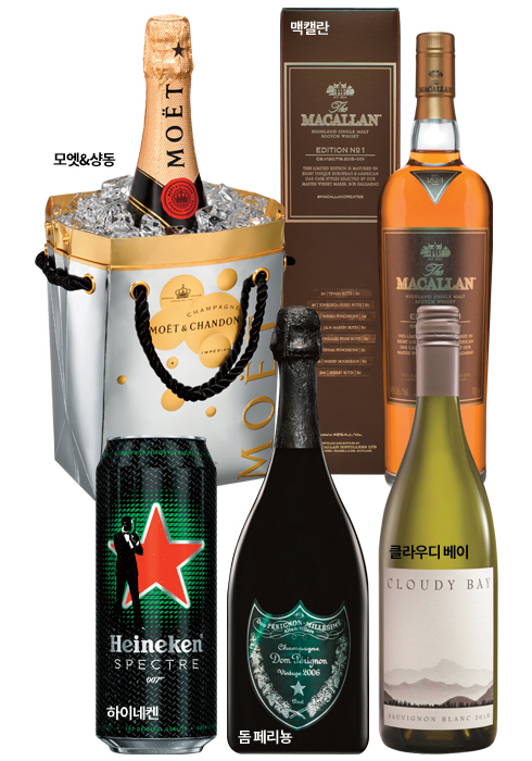 만남이 많은 연말을 겨냥해 한껏 맵시를 낸 각종 주류 제품이 쏟아지고 있다. ‘축배’를 위해서는 샴페인을 빼놓을 수 없을 터. 프리미엄 빈티지 샴페인의 제왕 돔 페리뇽은 2015년 연말 에디션으로 ‘창조의 힘’을 강조한 아트 컬래버레이션의 결과물을 내놓았다. 세계적인 아방가르드 아티스트 비요크(Bjo··rk)와 크리스 커닝햄, 2명의 크리에이터가 빚어낸 작품으로 ‘땅에서 마음으로’라는 콘셉트를 바탕으로 대지를 연상시키는 매혹적인 초록빛을 담아냈다. 이 협업에 사용한 샴페인은 ‘돔 페리뇽 빈티지 2006’(30만원대)과 ‘돔 페리뇽 로제 빈티지 2004’(50만원대). 연말 시즌을 겨냥해 나온 모엣&샹동의 ‘쏘 버블리 버킷(So Bubbly Bucket)’과 기프트 박스는 부드럽고 상큼한 버블 텍스처에서 영감을 받았다는 패키지 디자인이 돋보인다. 7만~8만원대. 싱글 몰트위스키 브랜드 맥캘란에서는 국내에 1천 병만 들여왔다는 10만원대 한정판 ‘맥캘란 에디션 넘버 원(The Macallan Edition No.1)’을 내놓았다. 꿀처럼 짙은 황금빛이 감도는 이 위스키는 셰리 오크 통에서 비롯된 깊고 풍부한 맛과 향이 일품이다. 오렌지, 사과 등 향긋한 과일 향과 계피, 말린 생강의 알싸함, 바닐라와 토피의 달콤한 맛을 느낄 수 있다. 우아한 품격과 생기를 갖춘 와인을 원한다면 탄생 30주년을 맞이한 ‘클라우디 베이 소비뇽 블랑 2015’를 눈여겨볼 만하다. 열성 팬이 많은 이 뉴질랜드 와인 브랜드의 소비뇽 블랑 2015년 빈티지는 강렬한 느낌과 침이 고이는 산도가 특징이다. 5만원대. ‘맥주파’에게는 영화 <007 스펙터>를 내세운 하이네켄의 스페셜 에디션 ‘스펙터’ 캔이 반가울 수도 있다. 첩보 영웅 캐릭터의 대명사 제임스 본드와 18년간 이어진 글로벌 파트너십을 토대로 한 디자인이다.