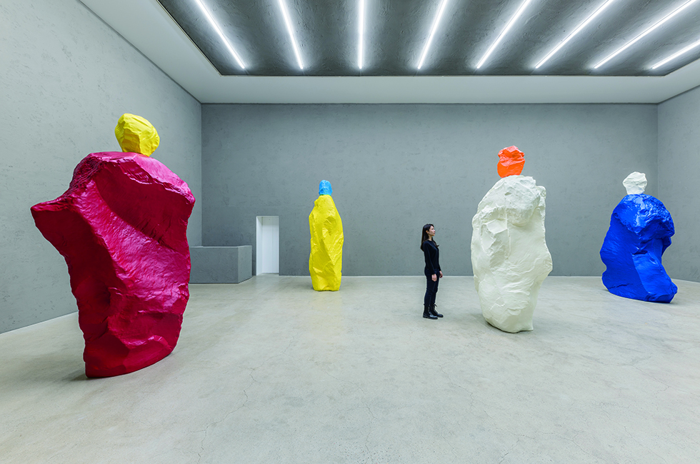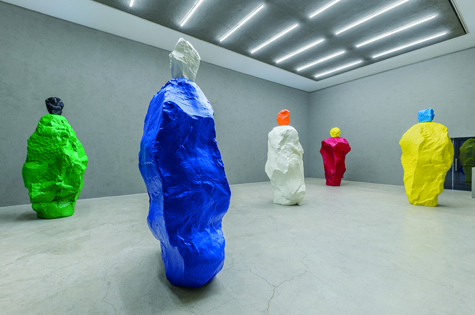 # 우고 론디노네 <nuns and monks by the sea>展_국제갤러리 서울 & 부산 ‘돌’이라는 소재가 지닌 힘은 우고 론디노네(Ugo Rondinone)의 손길을 만나면 특별한 미학적 오라를 품는 듯하다. 2013년 뉴욕 록펠러 센터 광장에서 ‘human nature’라는 이름으로 처음 우고 론디노네의 기념비적 청석 조각 작업이 소개된 이래 2016년 네바다 사막 위에 설치한 돌탑 형상의 거대한 작품 ‘Seven Magic Mountains’는 세계적으로 큰 주목을 받았다. 그리고 올봄, 국제갤러리 서울에서 그의 돌 조각이 다시금 존재감을 드러냈다. 국제갤러리 K3관의 6m 정도 되는 높은 층고를 활용한 5점의 ‘nuns and monks’ 연작은 언뜻 커다란 돌덩어리처럼 보이지만 안이 비어 있는 청동 조각이다(본래 작은 크기의 석회암 모형으로 제작된 작품을 스캔하고 확대해 청동 주물로 다시 탄생시킨 것이다). 제목이 말하듯, 성인(聖人)의 신비한 모습을 띠고 있지만 우상적 상징성으로 짓누르기보다는 관람객을 환영하는 ‘열린’ 존재를 의도했다고 한다. 작가는 언제든 일정한 색조의 작품을 보여주기 위해 차분한 조명만이 작품을 비추도록 전면 유리창을 필터로 감싸 빛을 되도록 차단했다. 그리고 모래 자국 같은 무늬를 띤 진회색의 시멘트를 전시 공간 전체에 발라 바닥과 벽이 단일한 콘크리트처럼 보이도록 했다. 이는 마치 구름 덕분에 그늘이 살짝 진 느낌을 들게 한다. 그리고 이 같은 날씨에 대한 암시는 부산의 전시 공간에서도 이어진다. 역시 유리창에 자외선 차단 필터를 씌운 공간에 작은 ‘mattituck’ 회화 시리즈 17점이 잔잔하게 빛을 발하고 있다. 작가의 스튜디오가 있는 뉴욕 롱아일랜드 매티턱에서 본 노을을 묘사한 이 앙증맞은 소품 시리즈는 지역명을 그대로 차용한 섬세한 수채화 연작으로 각각의 작품은 오로지 세 가지 색으로만 이루어져 있다.