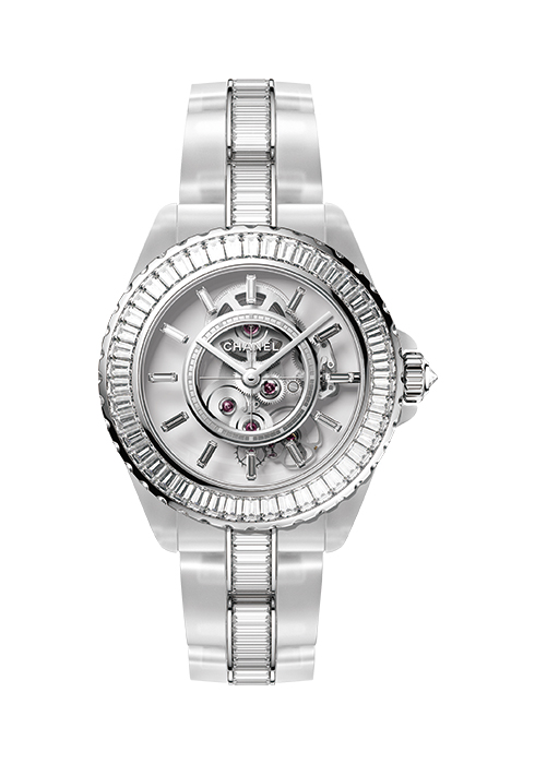 이번 컬렉션에서 빼놓을 수 없는 포인트 중 하나는 샤넬 워치가 구현한 ‘투명함’이다. 스켈레톤 워치 등 속이 보이는 투명한 디자인은 흔하지만 샤넬은 이 투명함을 워치의 케이스부터 다이얼, 브레이슬릿까지 곳곳에 녹여내고자 했다. 그 시작은 J12 엑스레이 스타(X-RAY Star)다. 가장 핵심적인 부분은 전체 시계의 몸체를 완성하는 프로즌 사파이어 크리스털이다. 이 소재를 사용함으로써 다이얼뿐 아니라 전체적으로 얼음과 같은 투명하고 차가운 감성을 부여한다. 케이스는 18K 화이트 골드 케이스로 완성했으며, 베젤에 46개의 바게트 컷 다이아몬드 약 5.46캐럿을 세팅하고 다이얼 역시 12개의 바게트 컷 다이아몬드 0.38캐럿으로 12개의 아워 마커를 매치해 전체적으로 투명하게 반짝이는 듯한 느낌을 구현했다. 브레이슬릿은 총 10.15캐럿의 1백38개 바게트 컷 다이아몬드를 세팅한 18K 화이트 골드, 프로즌 사파이어 크리스털로 완성해 통일감을 부여한 점이 돋보인다. 프리미에르 컬렉션에서도 투명함을 담은 특별한 피스들을 선보였다. 프리미에르 엑스레이(X-RAY)와 프리미에르 까멜리아 엑스레이(Came´lia X-RAY)다. 프리미에르 엑스레이는 기존 프리미에르만의 18K 화이트 골드 스퀘어 케이스에 사파이어 링크와 다이아몬드를 세팅한 화이트 골드 링크가 교차하는 투명하고 반짝이는 브레이슬릿으로 여성스럽고 우아한 무드를 한껏 배가한다. 다이얼에는 총 약 0.49캐럿의 191개 브릴리언트 컷 다이아몬드를 세팅했으며, 쿼츠 무브먼트로 작동한다.