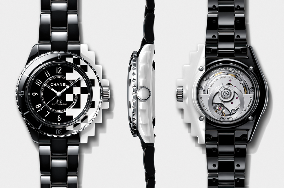 인터스텔라 컬렉션에서 눈에 띄는 또 하나의 모티브는 우주를 그래픽적으로 해석해 미래적인 느낌을 주는 모자이크 스타일의 제품들이다. 세라믹 케이스의 일부를 도려낸 듯한 화이트 픽셀 모티브를 베젤과 래커 다이얼의 블랙 컬러와 적절하게 매치해 그래픽적인 느낌을 완성한 J12 사이버네틱(Cybernetic)을 시작으로 화이트 세라믹 대신 다이아몬드로 픽셀 모티브를 완성해 더욱 신비스럽고 화려한 느낌을 더한 J12 하이퍼 사이버네틱(Hyper Cybernetic), 매트한 블랙과 화이트 세라믹이 어우러져 올 화이트로 시작해 그림자 속으로 들어가듯 검은색 세라믹이 스며드는 것 같은 느낌으로 하나의 컬렉션 워치를 완성한 J12 이클립스 박스 세트(Eclipse Boxed Set), 4분의 1만 다른 컬러의 세라믹과 소재로 세팅해 독특하고 유니크한 느낌을 선사하는 J12 스페이시오템포럴(Spatiotemporal)까지. 다양한 디자인과 방식으로 구성한 점이 돋보이며, 작은 워치에 컬러가 똑 떨어지게끔 깔끔하게 작업한 샤넬의 워치메이킹 기술력을 입증하는 피스들임에 틀림없다.
