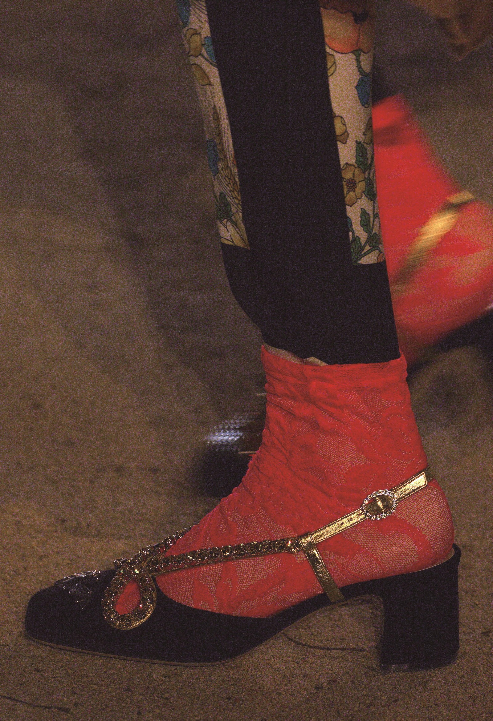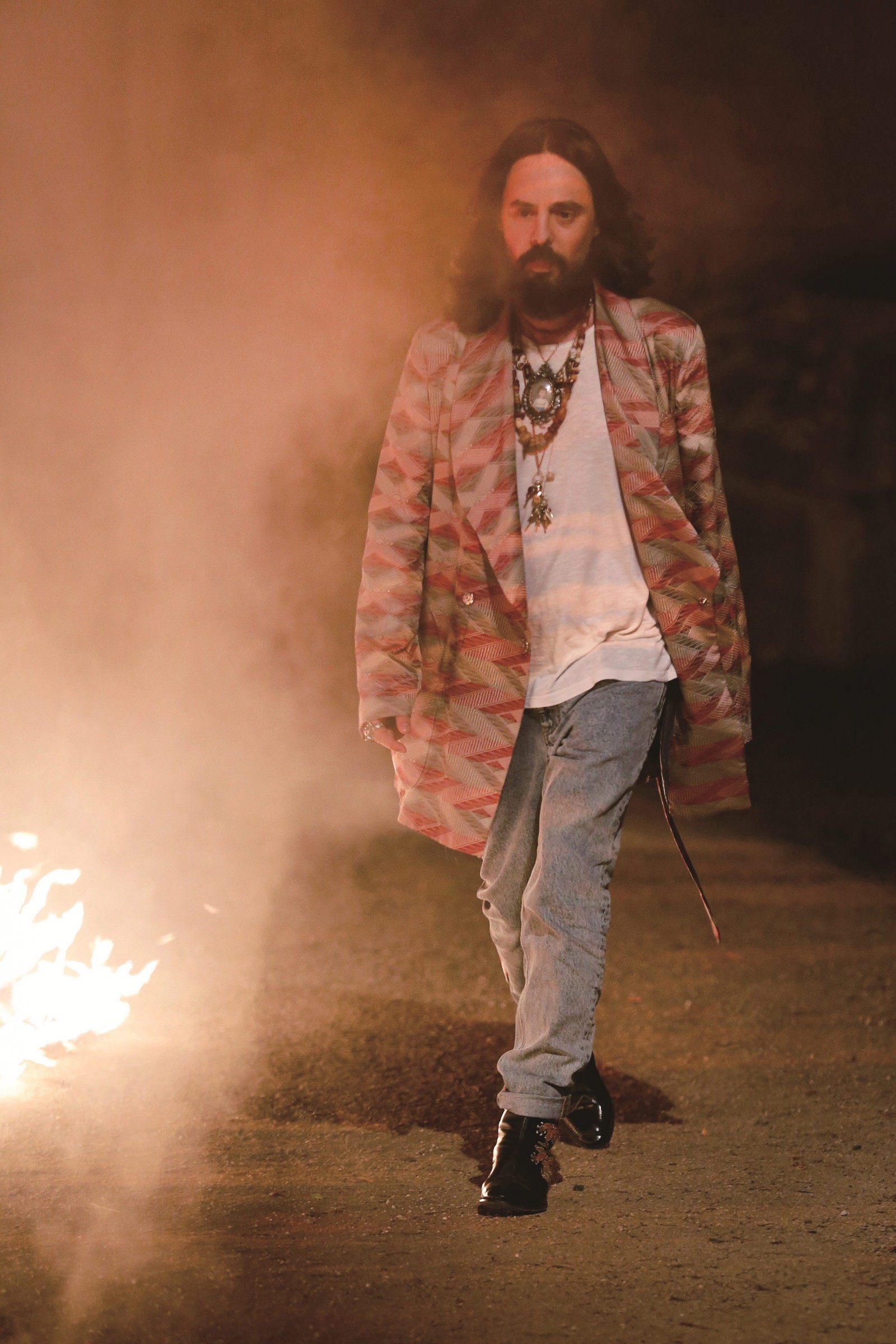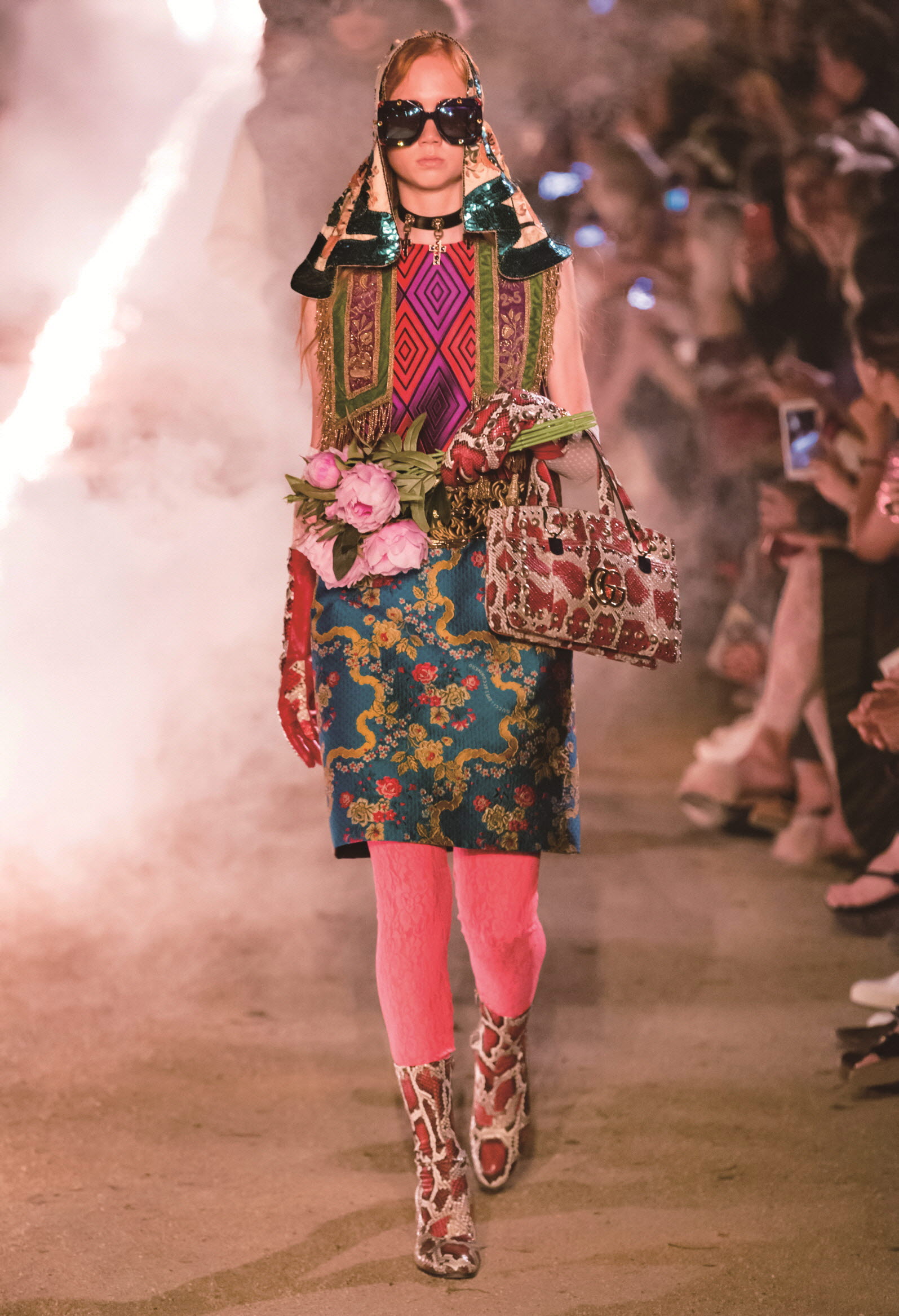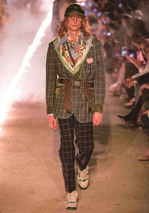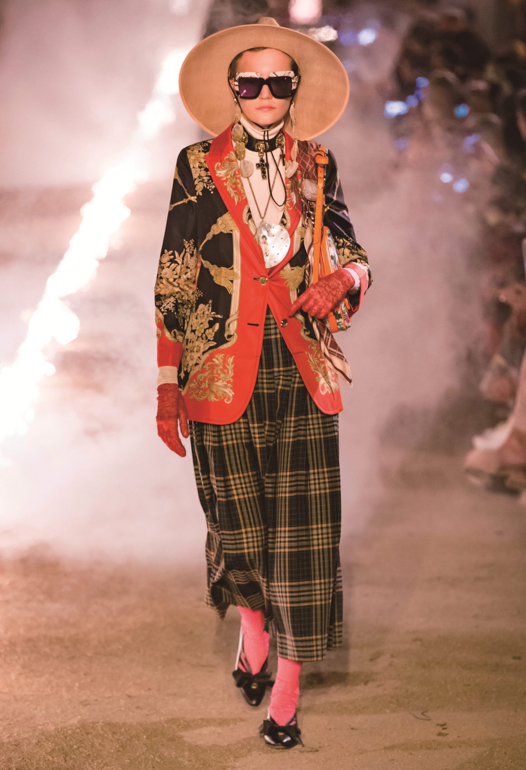 1, 4 클래식함과 보헤미안적인 요소가 믹스된 페미닌 룩. 오버사이즈 모자도 포인트다. 2, 3 구찌의 시그너처가 된 타이거 프린트와 과장된 디테일, 그리고 화려한 프린트가 돋보이는 룩들. 5, 6, 8, 19 남성복과 여성복의 경계가 점점 더 없어지는 추세. 레이어링과 화려한 액세서리에 주목할 것. 7,13 음산하고 웅장한 고스풍의 거대한 세트장을 연상시킨 쇼장. 불과 연기가 가득한 초현실적인 무대였다. 9 1970년대 록 스타를 떠올리게 하는 룩. 10~12 구찌 고유의 로고와 야구팀의 로고 프린트가 눈길을 끄는 액세서리들. 14 구찌의 전성기를 이끌고 있는 알레산드로 미켈레의 피날레 모습. 15 한류의 인기를 실감케 했던 엑소의 카이. 구찌 룩을 완벽하게 소화해냈다. 16~18 화려한 빈티지 무드와 구찌의 로고를 살린 뉴 액세서리 컬렉션.