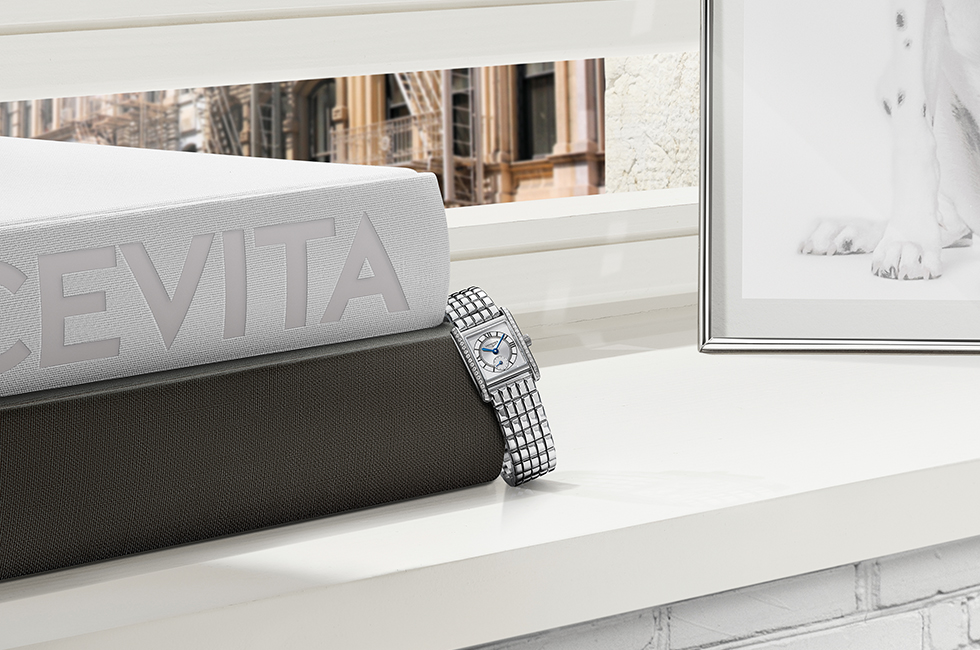 미니 돌체비타의 가장 큰 매력은 세 가지로 정리할 수 있다. 첫 번째는 이름에서 알 수 있듯 가로 21.5mm, 세로 29mm의 콤팩트한 사이즈와 좀 더 부드러워진 셰이프. 작은 케이스 안에는 매우 정밀한 L178 쿼츠 무브먼트를 장착했다. 두 번째는 직사각형 케이스 내부의 코스모 원형 다이얼. 스크래치 방지 사파이어 크리스털을 통해 보이는 코스모 다이얼은 실버 선레이 배경에 화이트 매트 아워 트랙이 이루는 미묘한 대비가 특징이다. 페인팅 처리한 로마숫자와 블루 스틸 핸즈는 다이얼의 밝은 색조와 대비되어 가독성을 높여준다. 마지막 세 번째는 1백98개 링크로 이루어진 유니크한 스틸 브레이슬릿이다. 이 디자인은 워치의 주얼리적 요소를 더욱 돋보이게 하고 착용자에게 특별함을 주기 위한 론진의 도전이기도. 착용감이 뛰어나고 케이스 디자인과 잘 어우러지며, 무엇보다 뱅글과 같은 데일리 주얼리와 레이어드해 개성을 표현하기에 안성맞춤이다.