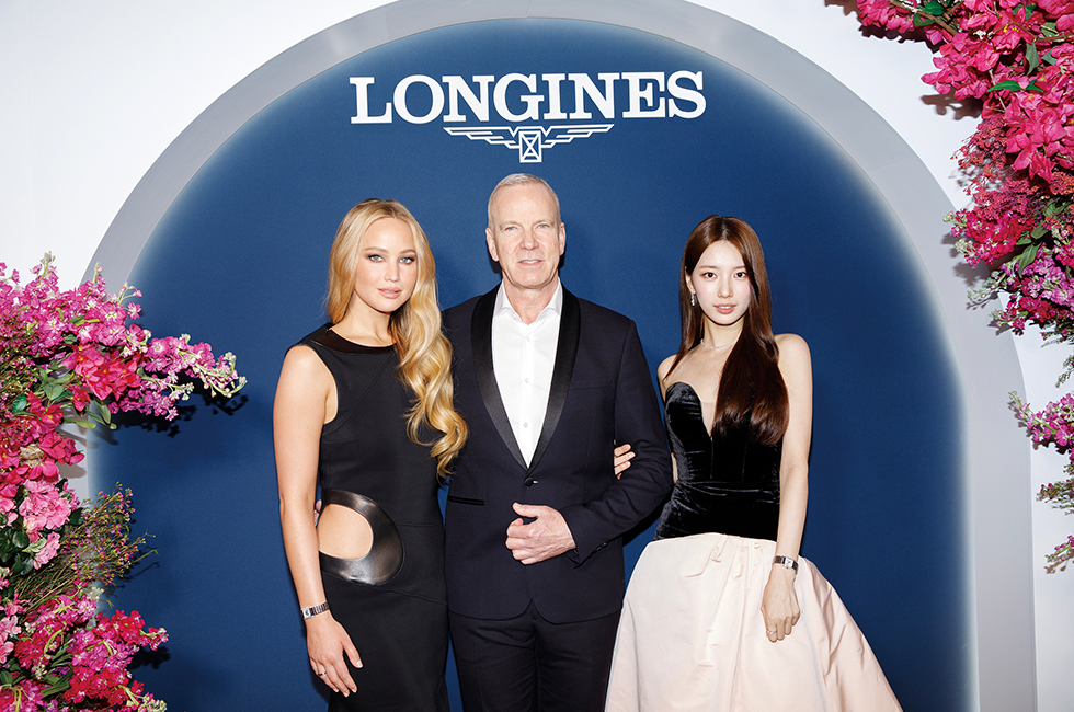 6, 8 미니 돌체비타 론칭을 기념하는 자리. 글로벌 앰배서더 제니퍼 로렌스와 수지, 그리고 론진 CEO 마티아스 브레스찬.