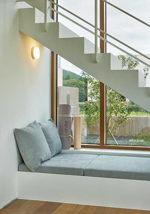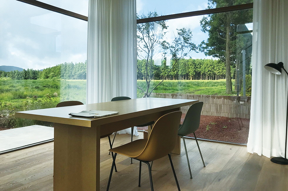 그런데 노동의 형태가 갈수록 다양해지고 근로 환경에 대한 조직 차원의 고민이 진화하면서 이런 인식은 변하고 있다. 사실 보수적인 기업 문화를 지닌 일본에서도 이미 ‘일과 휴가의 동거’라는 워케이션 개념이 자리를 잡은 지 꽤 오래됐다고 한다. 도시의 딱딱한 사무실 공간에서 나오기 힘든 창조적 영감을 북돋우려는 기업 차원의 원격 근무 프로그램, 혹은 복지 혜택으로 제공되는 식이다. 더구나 지금은 원격 근무가 ‘뉴 노멀’처럼 당연시되는 팬데믹 시대 아닌가. IT 기업이나 진취적인 마인드의 조직들은 복지뿐 아니라 일의 효율을 끌어올리는 차원에서도 워케이션에 관심을 둔다. 이 같은 맥락에서 ‘워케이션’ 철학을 공공연히 지향하는 코사이어티 빌리지 제주에서도 총 12채의 숙박 시설 중 절반은 기업을 대상으로 하는 레지던스 유형으로 운영하며, 연 단위로 계약한다(나머지 6채는 한 달 살기나 단기 체류를 원하는 개인 고객에게 할당된다). 모든 숙박 시설은 독채인데, 정원이 각 4명 정도라 임직원들이 돌아가면서 머무르는, 나름 ‘오붓한’ 구도가 형성되는 셈이다. 각종 행사를 위한 공간도 따로 있다.
