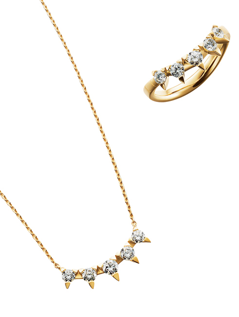 컬렉션 이름에 걸맞게 금방이라도 재잘거릴 듯한 식물을 표현하기 위한 최상급 다이아몬드에 18K 옐로 골드 스터드를 가시처럼 촘촘하게 세팅했다.