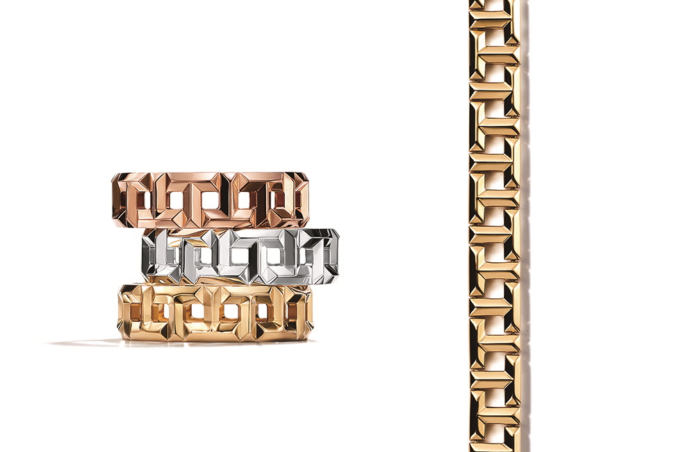 알파벳 T 모티브를 체인 형태로 교차한 구조적인 디자인이 돋보인다. 남녀 모두 착용 가능하며 옐로 골드, 로즈 골드, 2가지 소재로 출시한다.