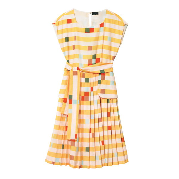 아코디언 플리츠 디자인과 미니멀한 스트라이프 패턴이 세련된 실크 원피스