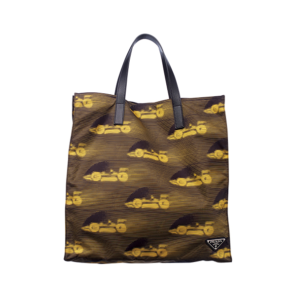 옐로와 블랙 컬러로 이루어진 그래픽 패턴이 돋보이는 사각 쇼퍼 백. 35X35cm,