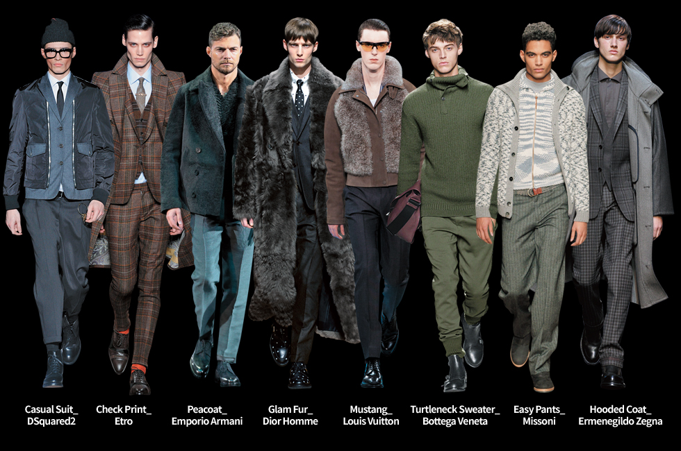 남성 컬렉션이 매 시즌 더욱 기대되는 건 시즌을 거듭할수록 격동적인 변화를 시도하는 맨즈 웨어 시장을 엿보는 재미가 쏠쏠하기 때문이다. 점점 더 진화하고 고급화되는 소재의 변화는 물론이거니와 T.P.O(time, place, occasion)에 따른 스타일의 구분이 모호해지고, 여성스러운 컬러 팔레트와 디테일을 서슴없이 활용하는 것만 보아도 남성복 시장이 얼마나 활기를 띠는지 실감할 수 있다. 남성복에 눈길이 가는 또 다른 이유는 실험적인 시도보다는 실용성을 중시해 구매욕을 상승시키는 커머셜한 아이템이 가득하다는 점이다. 특히 이번 시즌에야말로 절충적이고 웨어러블한 스타일을 제안하려는 시도가 돋보였다. 먼저 위시 리스트에 당장 추가해도 좋을 만큼 다채롭고 실용적인 아우터가 대거 등장했는데, 어떤 종류의 아우터든 한층 젊어졌다는 점이 새롭다. 대표적으로 소재, 길이, 실루엣으로 다양한 변화를 준 피코트를 꼽을 수 있다. 기본 스타일은 유지하되, 소재에 변화를 준 제품이 주를 이룬다. 퍼처럼 보이는 울을 사용해 구조적인 디자인의 피코트를 선보인 엠포리오 아르마니, 피코트에 퍼를 장식적으로 매치한 페라가모가 그 예다. 에르메네질도 제냐는 포멀한 수트에 무심하게 툭 걸친 클래식한 후디 코트를 제안했고, 수트에 파카를 매치한 캘빈 클라인은 보다 활동적인 젊은 감성의 비즈니스 아우터를 선보였다. 수트 역시 캐주얼한 제품이 강세다. 노타이로 연출하고 기장이 짧으며 경쾌한 것이 특징이다. 디스퀘어드2는 클래식한 울 수트의 슬리브와 프런트 패널에 가죽이나 데님 디테일을 패치워크하는가 하면, 루이 비통은 어깨의 패드를 제거하고 주름이 생기지 않는 가벼운 소재를 사용한 위크엔드 수트를 선보였다. 여자가 봐도 탐날 만큼 고급스러운 니트 컬렉션도 주목하자. 목선 가까이 올라오는 크루넥 니트의 약진이 두드러지는데, 셔츠나 재킷에 매치하는가 하면 펜디의 롱 스웨터 코디네이션처럼 아우터 아래로 니트가 드러나게 연출하기도 했다. 목선이 여유로운 터틀넥 니트 또한 매력적으로 다가온다. 보테가 베네타의 터틀넥과 같이 칼라처럼 접어 연출하는 스타일은 목이 짧아 보일까 봐 걱정했던 사람에게 희소식이 될 듯.