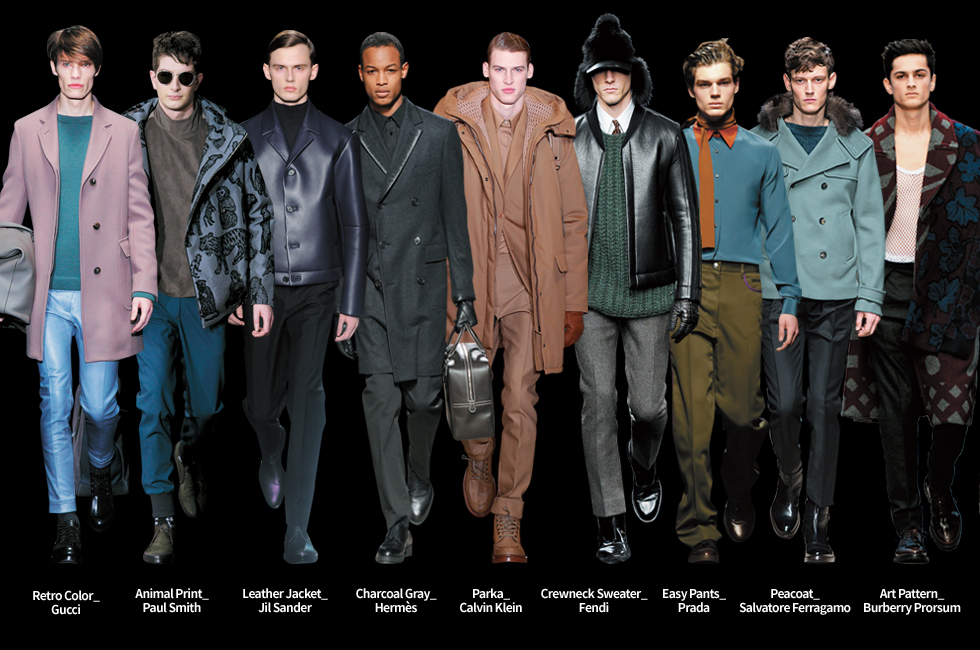 컬렉션 전반적으로 실용성이 부각되는 만큼 몸을 구속하지 않는 편안함도 중시된다. 트레이닝 팬츠를 연상케 하는 이지 팬츠(보테가 베네타)와 여유 있는 와이드한 실루엣의 테일러드 팬츠(미쏘니, 프라다)가 대표적. 이는 스포티한 느낌이 아닌 캐시미어 니트나 드레시한 실크 셔츠와 매치해 고급스럽고 세련된 룩을 연출하는 것이 포인트다. 겨울 시즌의 하이라이트라 할 수 있는 모피와 가죽 아이템도 남성 컬렉션에서 빼놓을 수 없다. 시어링, 라쿤, 폭스 등 다채로운 소재의 퍼를 소개했는데, 공통점은 여성 모피를 연상케 하는 화려한 느낌에 남성적인 카리스마를 더한 야성적인 무드의 퍼를 강조했다는 점. 실루엣 역시 볼륨감 있게 디자인해 스타일에 강렬한 임팩트를 더한다. 작년에 이어 올겨울에도 무스탕의 열기는 계속될 전망. 지난 시즌에는 비현실적으로 커다란 오버사이즈의 무스탕 코트가 주를 이뤘다면, 이번 시즌엔 좀 더 경쾌하고 활동적인 디자인이 눈에 띈다. 아우터뿐만 아니라 스웨트셔츠, 팬츠에도 활용되며, 무스탕의 시어링을 겉면에 노출시켜 마치 퍼 재킷처럼 연출한 루이 비통의 룩도 눈여겨보자. 컬러 트렌드는 F/W 시즌에 걸맞게 카키, 캐멀, 딥 그린 등의 어스 컬러와 더불어 코발트 블루, 파스텔 계열이 포인트 컬러로 등장했다. 여기서 특히 주목할 점은 바로 차콜 컬러가 블랙을 대신한다는 것이다. 파리, 밀라노, 런던, 뉴욕 등 4대 컬렉션에서 공통적으로 관찰할 수 있는 깊은 색감의 차콜 컬러는 톤온톤으로 매치해 세련된 느낌을 내고, 블랙 대신 포인트 컬러로 사용되었다. 모던한 레트로 컬러의 향연도 이어졌는데, 안개가 낀 듯 탁하면서도 풍부한 컬러 톤의 더스티 파스텔컬러를 키 컬러로 제시한 구찌의 컬렉션을 참고할 것. 프린트는 클래식하고 친숙한 모티브부터 아트와 결합해 위트를 더한 키치한 패턴까지 적극 활용되었다. 전통성이 돋보이는 체크 패턴은 에트로, 생로랑, 에르메네질도 제냐에서, 동물원을 연상케 하는 각종 동물 모티브는 폴 스미스, 발렌티노에서 위트 있게 표현했다. 더불어 아트를 메인 테마로 해 영국 화가들의 작품, 런던 지도 프린트를 활용한 버버리 프로섬 역시 패션 피플의 눈길을 사로잡기에 충분했다.