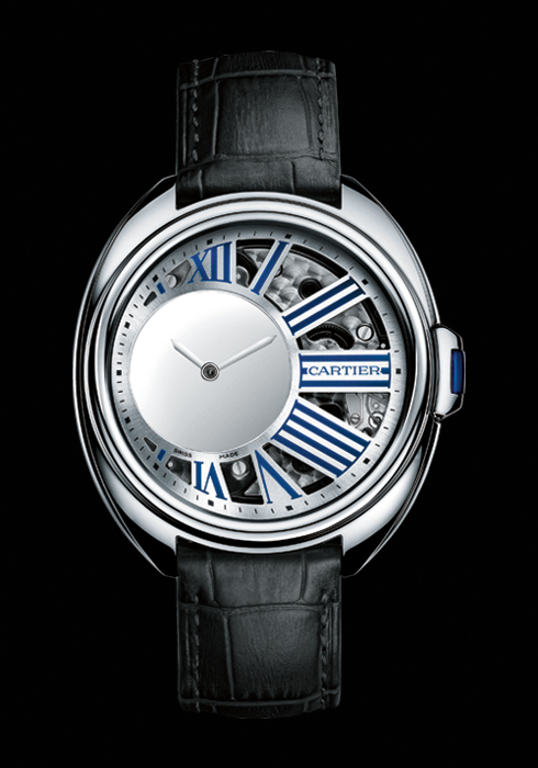 시계 예술의 매력을 유감없이 보여주는 새로운 메커니즘의 워치. 까르띠에의 새로운 아이콘이 된 끌레 컬렉션의 아름다운 유선형 케이스를 더욱 부각하는 디자인이다. 투명한 다이얼 중심에 위치한 2개의 핸즈가 공중에 붕 떠 있는 듯 보이는데, 로마자 사이로 보이는 스켈레톤 처리한 무브먼트의 복잡성과 대비되어 더욱 드라마틱하다. 브랜드 고유의 블루 컬러 로마자를 그래픽적으로 처리했고, 커다란 괘종시계의 태엽 형태를 연상케 하는 크라운이 고전미와 현대적인 아름다움을 동시에 표현한다. 까르띠에 매뉴팩처의 매뉴얼 와인딩 메캐니컬 무브먼트인 9981 MC 칼리버를 장착해 까르띠에라는 브랜드가 시계 비즈니스에서 놀라운 속도로 성장하고 있다는 사실을 보여주는 모델이다.