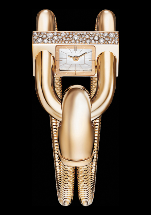 옐로 골드와 다이아몬드, 머더오브펄이 어우러진 완전히 새로운 시계, 바로 반클리프 아펠의 오랜 유산을 재해석한 까데나 컬렉션이다. 유명한 알함브라 모티브와 지퍼 모티브의 네크리스, 발물림이 보이지 않는 미스터리 세팅 등 아름다운 아이콘을 선보인 반클리프 아펠에서 야심차게 내놓은 새로운 시계로, 클래식함과 대범함을 모두 지녔다. 다이얼이 작아 브레이슬릿에 감추어진 시크릿 워치의 느낌을 풍기는데, ‘까데나(Cadenas)’는 프랑스어로 자물쇠를 의미한다. 주얼리의 가치와 고전미를 완성도 있게 담을 수 있는 브랜드만이 선보일 수 있는 독보적인 디자인으로 많은 여성들의 주목을 받았다. 총 아홉 가지 디자인으로 선보인다.