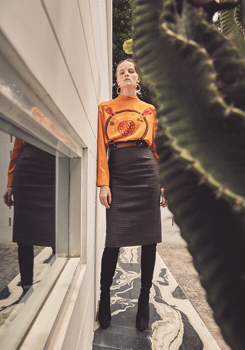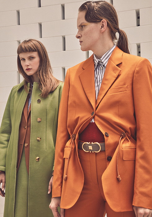 (오른쪽) 오렌지 컬러 재킷 3백9만원, 팬츠 1백15만원, 스트라이프 셔츠 99만원, 버건디 웨이스트 밴드 19만원, 가죽 로고 장식 벨트 57만원 모두 살바토레 페라가모.