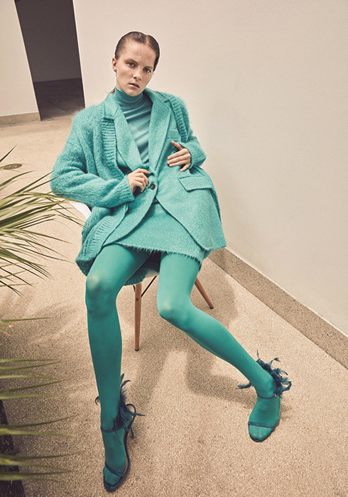 블루 그린 컬러 니트 카디건, 재킷, 터틀넥, 스커트, 레깅스 모두 가격 미정 막스마라.