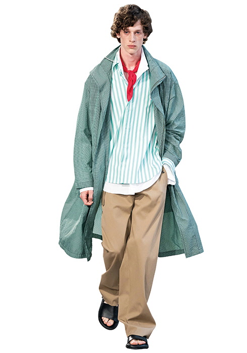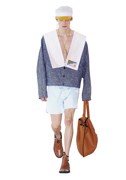 이번 시즌 영감의 선택지는 바다였다. 프라다, 랑방, 로에베 등이 낙낙한 실루엣의 세일러 톱, 노티컬 스트라이프, 해군 모자, 바다의 푸르름 등 머린 보이의 아름다움을 컬렉션에 올렸다. 해군 병사들이 입는 제복에서 힌트를 얻은 요소는 바다 너머 세상을 동경하는 순수한 소년의 이미지를 담아내는 데 매우 효과적이었다. 그중 랑방의 컬렉션은 바다의 모든 것을 담아냈다. 가죽 소재 세일러 칼라를 다양한 방식으로 적용했고, 고래와 파도 프린트, 윈드브레이커 재킷과 해군 점퍼 등으로 바다 이야기를 이어나갔다. |