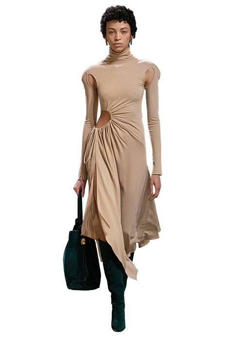 시원하게 등을 드러낸 지방시의 관능적인 베어 백 드레스부터, 여기저기 귀여운 구멍이 난 미래적인 프라다의 니트와 저지 톱에 이르기까지. 2021년 S/S 시즌을 대표하는 장식적 디테일은 바로 ‘컷아웃’이 아닐까? 이는 룩에 특정한 분위기를 부여할 뿐 아니라 시각적 재미를 더하고, 전체적인 실루엣과 핏을 완성하는 역할까지 한다. 휴고 보스는 자칫 평범해 보일 수 있는 니트 롱 드레스의 어깨, 허리, 다리에 비대칭의 과감한 컷아웃과 슬릿을 가미해 은근한 긴장감을 부여했다. 한편 오프화이트가 선보인 누드 저지 드레스에서 암홀의 컷아웃 디테일은 어깨의 과장된 패드 장식과 어우러지고, 허리 부분의 큼직한 컷아웃은 드로스트링과 만나 드레이퍼리를 연출하며 드레스의 실루엣을 보다 입체적으로 완성했다.
