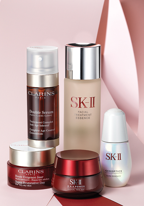 더블 세럼 30ml 12만원 모두 클라란스. 문의 080-542-9052, 페이셜 트리트먼트 에센스 160ml 19만원대, 제놉틱스 극광 에센스 30ml 17만원, R.N.A 파워 크림 50g 13만원대 모두 SK-II. 문의 080-023-3333