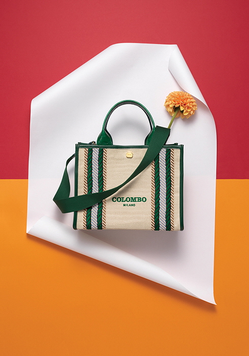 면 혼방 천연 라피아 소재에 콜롬보의 로프 디테일을 가미했다. 광택을 살린 밀레니엄 악어가죽 핸들을 매칭해 실용성과 고급스러움을 살린 디자인이 특징. 오렌지, 블루 컬러도 선보인다. 이탈리아 아말피 해변으로의 여행을 콘셉트로 한 M 사이즈 라피아 토트백 29.5X23X16cm, 3백18만원 콜롬보 비아 델라 스피가. |