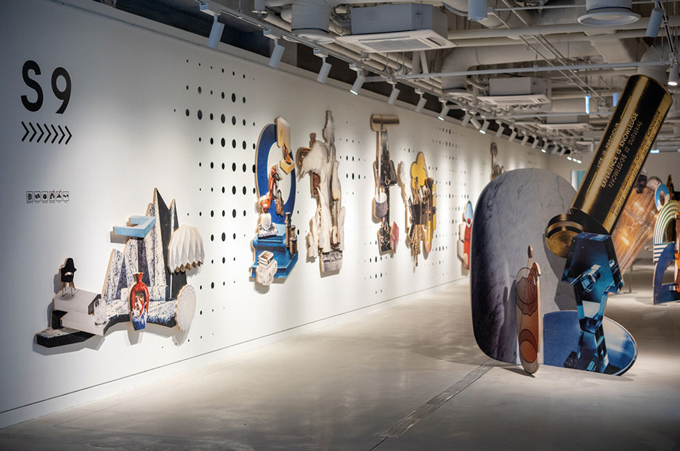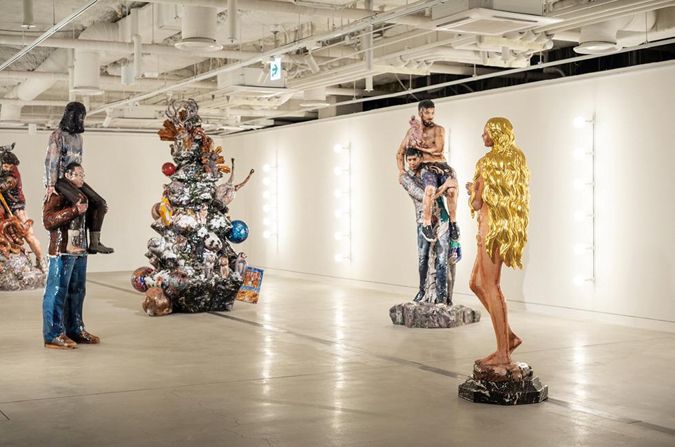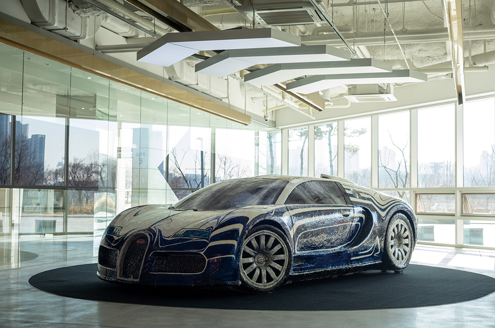 1 사진과 조각, 공간 연출이 어우러져 하나의 커다란 촬영 세트장 같은 장면을 연출하는 수원시립아트스페이스광교 <아워세트_아워레이보 X 권오상>展의 세트 2 전시 모습. 권오상의 대표작인 ‘데오도란트 타입’ 작품이 전통적인 조각상의 포즈를 취하고 있는데, 아워레이보의 화려한 조명 연출 방식을 만나 패션쇼의 한 장면처럼 보인다. 2 세트 9 설치 전경. 자작나무 판 위에 이미지가 담긴 나무판을 쌓아 올리는 콜라주 같은 형태로 완성하는 ‘릴리프(Relief)’ 연작과 독특한 공간 연출이 만난 세트 연작을 선보였다. 서로 연결성이 없는 이미지를 중첩해 평면으로 완성된 작품은 아워레이보의 연출과 만나 독특한 분위기를 뿜어낸다. 3 슈퍼카를 본뜬 작품 ‘더 스컬프쳐 4’(2005~2015)를 좌대가 아니라 검은색 카펫 위에 선보여 ‘사물’로 인식되도록 유도한 세트 1 모습.
