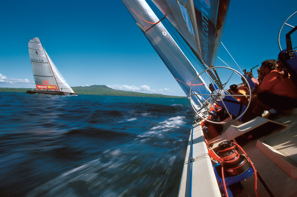 4 경주 중인 요트에서 찍은 사진. 프랑스 보트가 젊은 미국 팀을 따라잡는 모습으로 오클랜드에서 촬영되었다.