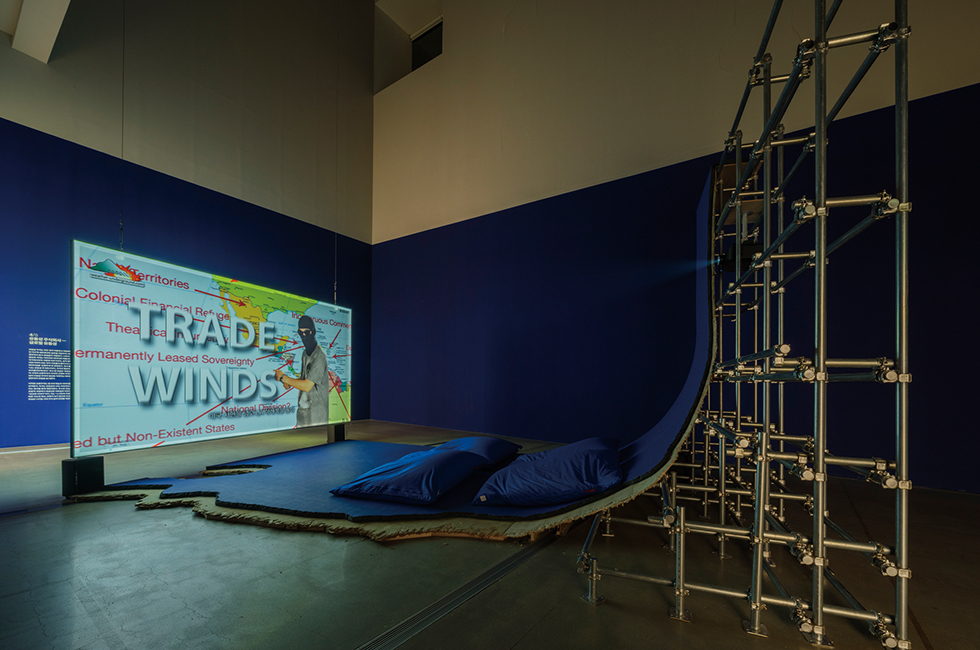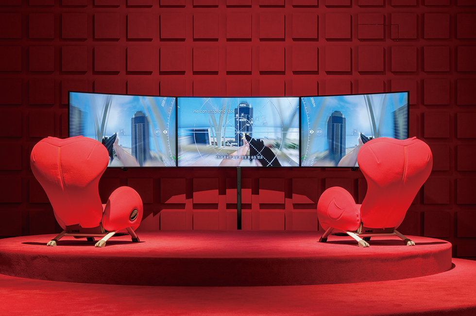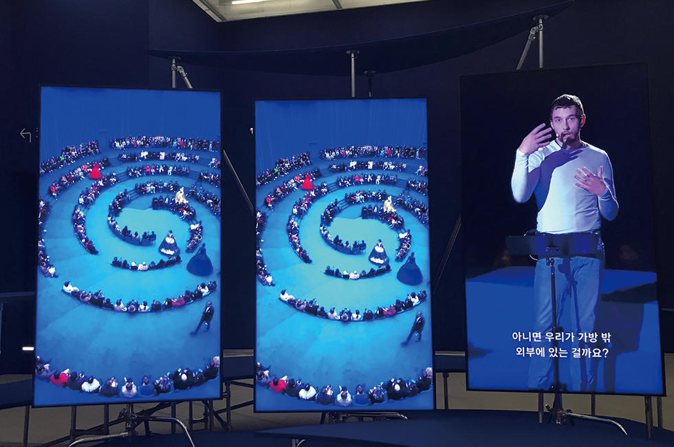 작품의 면면도 존재감을 뿜어내지만, 관람 환경 자체도 주목할 만한다. 각 비디오에 대해 완전히 몰입할 수 있도록 객석까지 하나의 설치 작품처럼 연출해 특별한 관람 경험을 선사하기 때문이다. 특히 2015년 베니스 비엔날레 독일관 전시관에서 선보인 ‘태양의 공장’은 해변의 비치 의자에 누워서 볼 수 있도록 함으로써 공상과학 매트릭스로 빨려 들어가도록 만든다. 글로벌 이민과 재정적 불평등을 다룬 비디오 ‘유동성 주식회사(Liquidity Inc.)’(2014)도 푸른 물결 모양의 편안한 좌석이 설치된 공간에서 볼 수 있다.