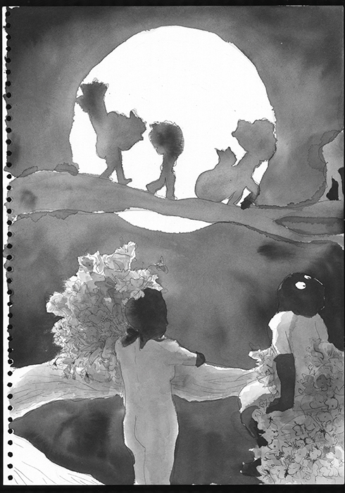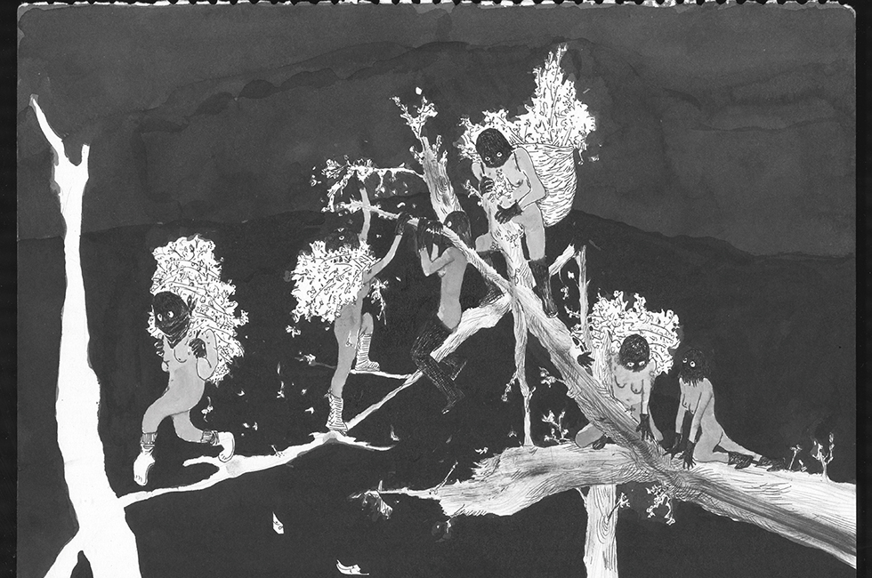 복면으로 얼굴을 가린 여러 명의 여인이 바쁘게 어디론가 향한다. 자세히 살펴보니 알몸에 검정 장갑과 부츠만 착용한 채 힘을 합쳐 커다란 꽃 더미를 운반하고 있다. 누군가의 의뢰를 받아 꽃을 따서 훔치는 이들의 정체는 작가의 상상 속에서 탄생한 ‘꽃도둑’들이다. 수십 점의 드로잉으로 이루어진 ‘꽃도둑’ 연작은 공방에서 쓰고 남은 자투리 종이에 그때그때 사용 가능한 재료로 작업한 흑백 그림이다. 작가는 먹을 담은 병과 펜, 종이를 들고 다니며 시간이 날 때마다 틈틈이 그림을 그렸다. 주어진 재료를 사용하다 보니 종이의 사이즈가 모두 제각각인데, 오히려 다양한 화면 크기에 맞춰 장면을 구성하고 그에 따라 새로운 이야기와 사건을 만들어내는 계기가 됐다. 물론 다음 장면으로 넘어가는 데는 매끄러운 스토리텔링이나 개연성이 반드시 동반되지는 않는다. 삶이 그러하듯, 각 컷이 품고 있는 그 순간의 감상에 충실하면 되기에.