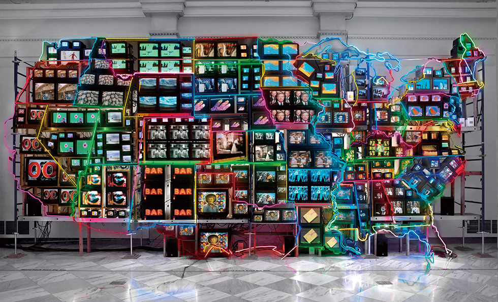 Nam June Paik, ‘Electronic Superhighway: Continental U.S., Alaska, Hawaii’(1995), fifty-one channel video installation(including one closed-circuit television feed), custom electronics, neon lighting, steel and wood; color, sound, Smithsonian American Art Museum, Gift of the artist, 2002.23, © Nam June Paik Estate