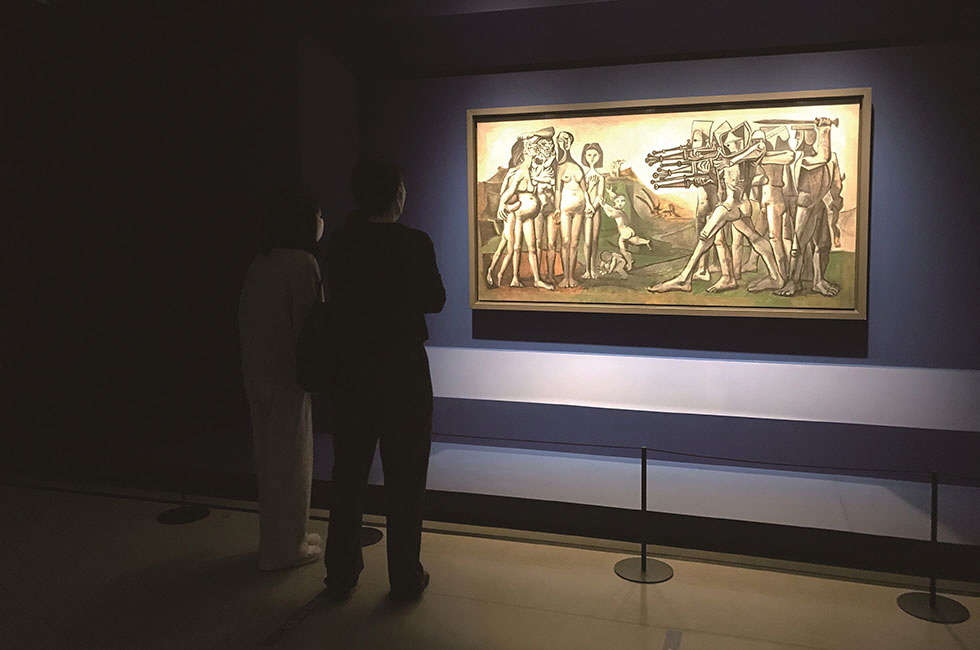 8 예술의전당 한가람미술관 전시장에서 파블로 피카소의 1951년 작 ‘한국에서의 학살(Massacre en Core´e)’을 감상하고 있는 남녀 커플. 합판에 유화. 작품이 발표된 지 70년 만에 한국 땅을 처음 밟았기에 많은 관람객의 발길을 이끌고 있다.