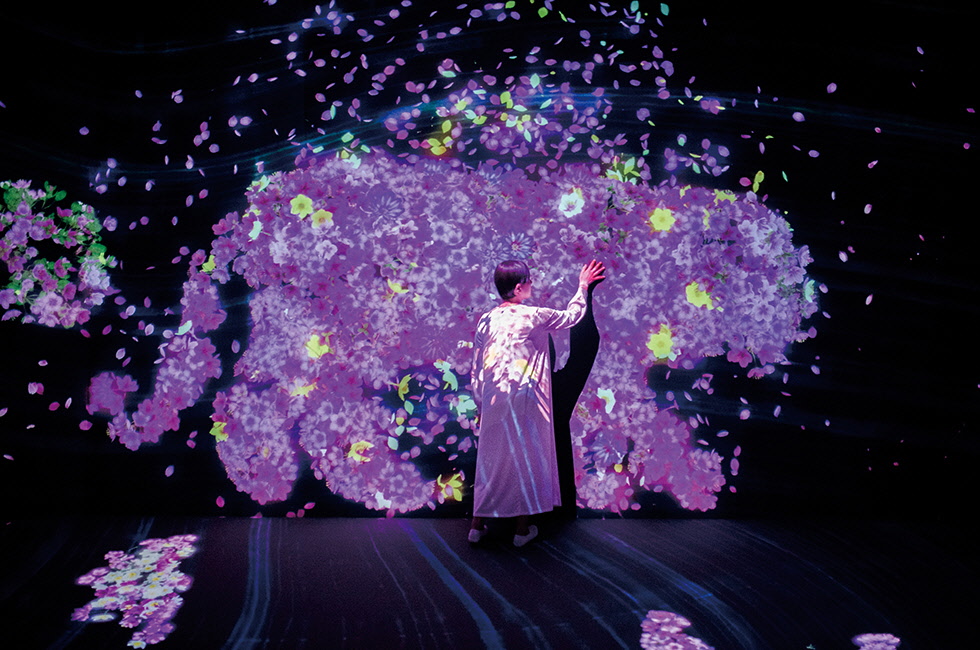 미술가, 엔지니어, 수학자, CG 애니메이터, 건축가 등 다양한 분야의 전문가로 구성된 다국적 아티스트 그룹 teamLab. 일본 오다이바의 명물인 <teamLab Boderless> 상설전을 접했거나 싱가포르의 랜드마크 마리나 베이 샌즈에 자리한 아트사이언스 뮤지엄(ArtScience Museum)을 방문한 이들이라면 이미 ‘팬’이 된 사례가 많을 듯하다. 서울 동대문디자인플라자(DDP) 배움터 디자인 전시관에서 선보이는 <teamLab:LIFE>展은 그런 면에서 개막하기 전부터 관심을 한 몸에 받았다. 일본, 싱가포르는 물론이고 뉴욕, 런던, 파리 등 세계 각지에서 디지털 시대의 융합적인 예술을 섬세한 감성으로 빚어내는 teamLab의 새로운 대형 전시이기 때문이다. 인류에게 아름다운 축복을, 때로는 지나치게 가혹한 위협을 주는 존재인 자연과 생명의 경이로움을 다루는 이번 전시는 8개 공간을 감각적으로 수놓는다. 사면의 벽을 가득 채운 디지털 영상이 다채로운 춤사위를 펼치노라면 관객은 공간의 마법에 절로 빠져든다. 호쾌하게 철썩이는 파도를 따라 이동하면서 신이 나 ‘셀카’를 찍기도 하고, 계절의 변화에 따라 꽃이 천천히 피어나는 스크린을 하염없이 바라보기도 하며, 벽에 ‘터치’를 하면 생기는 ‘인터랙티브’ 반응에 즐거워하기도 한다. 잠시나마 좌절스러울 수도 있는 현실을 잊을 수 있는 몰입의 순간이 그렇게 찾아온다.