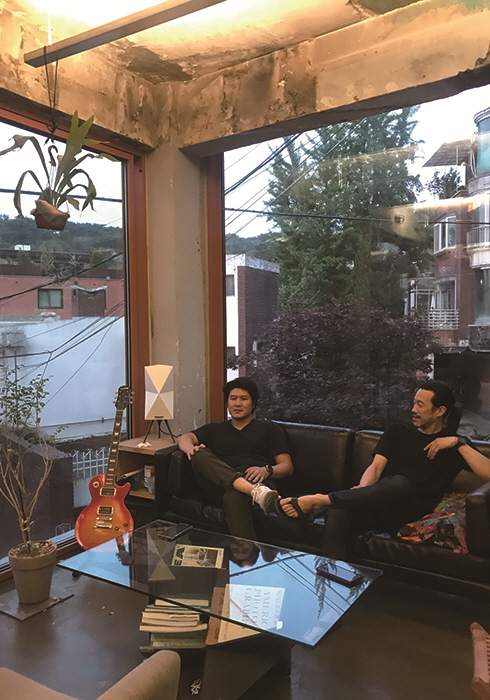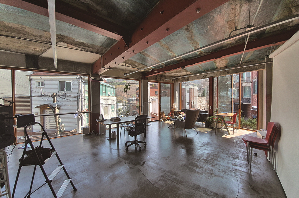 그렇게 완성한 필동 팩토리의 2층은 박경근 작가의 작업실인 동시에 조재원 작가와 종종 대화나 아이디어를 나누는 소통의 공간이다. 둘 다 미국에서 공부하고 활동했다는 공통분모가 있어서인지 언뜻 성격이 다른 것 같아도 잘 통한다. 박경근은 주로 한국 근현대사의 역사적 원형을 소재로 한 다큐멘터리 영화 <청계천 메들리>(2010), <철의 꿈>(2014), <군대: 60만의 초상>(2016) 등으로 미술계와 영화계에서 동시에 주목받는 작가. 작품에서 풍기는 인상처럼 그의 작업실도 건물에 숨겨져 있는 골조나 리모델링 과정에서 보강된 자재가 거의 가공 없이 노출되는 인더스트리얼 분위기로 꾸몄다. 그리고 그의 개인적인 주거 공간인 3층과 더불어 곳곳에 조 작가와 송 대표의 흔적이 묻어 있다. 예컨대 깔끔하면서도 운치 있는 주방 가구라든지 반드시 좌우 발을 교대로 딛어야 하는 묘하게 깜찍한 계단 등은 조 작가의 ‘작품’이고, 건물 앞 철제 간판은 송 대표의 손길이 닿았다.