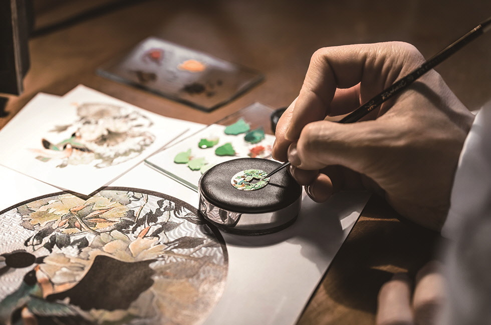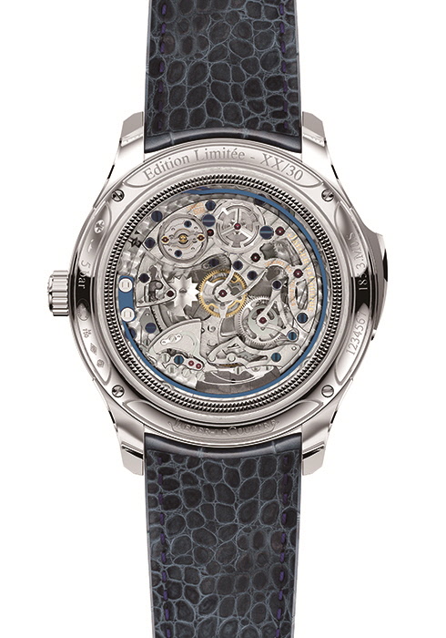 또 이 시계는 오토매틱 와인딩 시스템을 통해 시계를 따로 조작하지 않아도 윤년을 포함해 일수가 다른 달에도 정확한 캘린더 정보를 표시하도록 했다. 주목해야 할 다른 특징으로는 아워 및 미닛 핸드 축에 가깝게 자리한 직관적인 시큐리티 존. 해당 인디케이터는 10시와 1시 방향 사이에 자리한다. 정교한 마감 기법이 돋보이는 무브먼트의 움직임은 시계 뒷면에서 볼 수 있는데, 무브먼트 내부에 숨겨진 칼리버 950의 와인딩 로터도 관찰할 수 있도록 퍼페추얼 캘린더와 미닛 리피터 사이에 배치했다. 챕터링과 새틴 마감, 코트 드 주네브 장식과 같은 무브먼트의 섬세한 마감 요소들은 놓치면 아쉬울 관전 포인트. 마스터 그랑 트래디션 미닛 리피터 퍼페추얼은 메티에 라르 아틀리에에서 수작업으로 제작되는 네오클래식 스타일의 그레인 처리 실버 다이얼과 반투명한 딥 블루 기요셰 에나멜 다이얼, 두 가지 버전으로 출시된다. 그야말로 기술적 혁신을 바탕으로 쌓아온 브랜드의 유산과 미니어처 장식 기법의 탁월한 예술을 결합해 소네리 타임피스를 제작해온 그랑 메종의 1백49년 전통을 고스란히 보여주는 시계라 할 수 있다.