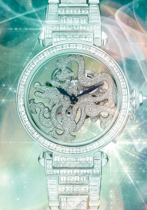 투명한 다이얼과 백 케이스를 통해 드래건 형태의 무브먼트를 온전히 볼 수 있는 아트피스. 베젤과 밴드에 에메랄드 컷 다이아몬드를 세팅해  하이 주얼리 워치로서의 면모를 드러냈다. 드래건의 눈은 에메랄드로 완성했다. 가격 미정.