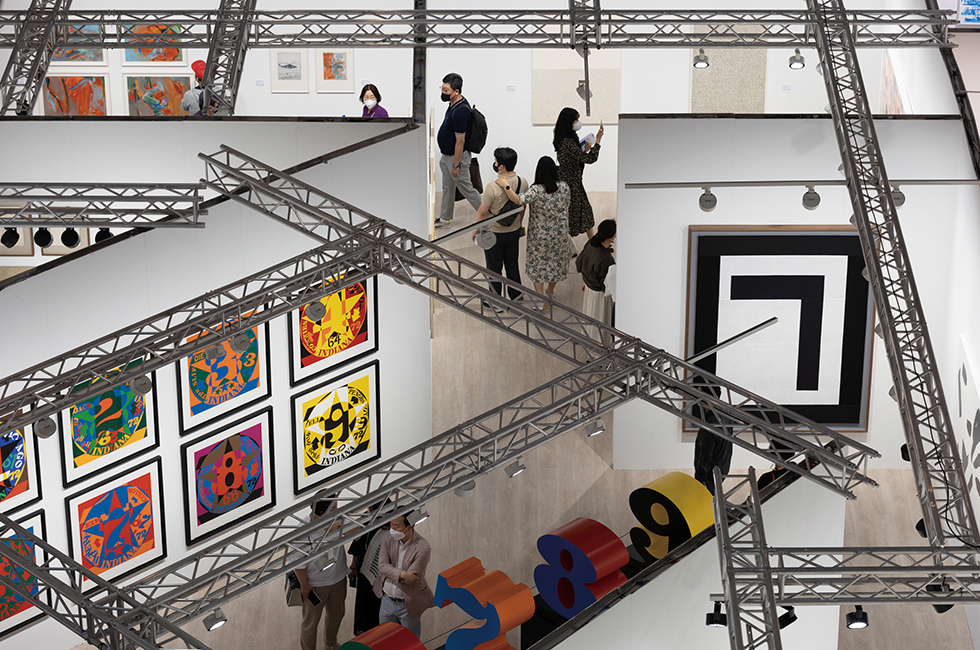 짐작은 했지만 ‘역시나’였다. 최근 미술계는 국내외를 막론하고 호황기인지라 상반기를 대표하는 행사인 아트부산에도 인파가 몰릴 것이라는 예상은 충분히 할 수 있었다. 그리고 적어도 ‘수치’로는 예상(6백억원 수준)을 뛰어넘는 결과가 나왔다. VIP 프리뷰를 시작으로 나흘간(5.12~15) 진행된 아트부산 2022는 10만 명 넘는 관람객을 동원하고 판매액은 전년 대비 2배 이상(7백46억원대 추정) 늘어난 괄목할 만한 성과를 냈다. 불과 한 달여 전에 열린 부산국제화랑아트페어(BAMA)도 10만 명 수준의 방문객을 불러모았는데, 다시 이 정도로 발길이 모였다는 건 현대미술 장터를 둘러싼 열기가 얼마나 대단한지 보여주는 단적인 증거다. 일부 갤러리들은 첫날부터 ‘솔드아웃(매진)’ 소식을 알리며 개막부터 열띤 양상을 띤 올해의 아트부산에는 1백33개 갤러리(국내 1백1개, 해외 32개)가 참여했다. ‘아트 페어 도시’로서의 가능성이 눈에 띈 2019년에 비해서는 다양성의 면모가 다소 떨어진 모양새다. 당시 17개국에서 1백64개 갤러리가 참가했는데, 그중 58개가 해외 갤러리였다. 여기에는 세계 최고 아트 페어 브랜드인 아트 바젤에 나가는 유럽 화랑도 처음 포함돼 눈길을 끌었다.