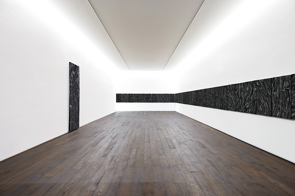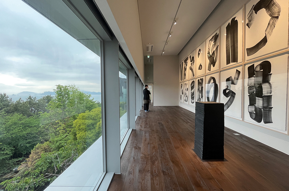 시그니엘 부산이 자리한 부산 달맞이길의 명물 갤러리 조현화랑은 올해 단단히 벼른 느낌이었다. 담쟁이 덩굴로 덮인 소담스러운 건물을 확장해 2층 공간까지 거느린 전시 무대를 공개했는데, 그 첫 단추로 ‘숯의 작가’로 세계적인 명성을 쌓아가고 있는 이배 작가의 개인전 <oblique/비스듬히>를 선보였다(오는 7월 3일까지). 달맞이길의 새 공간과 더불어 해운대 공간에서도 동시 진행되는 이 전시는 일단 1층 전시장 전체를 수놓고 있는 존재감 넘치는 대형 설치 작업부터 절로 탄성을 자아내게 한다. 조현화랑 큐레이터는 “1층 공간 자체가 마치 커다란 캔버스인 듯 벽과 바닥을 종이로 씌워 그림 공간을 설정했다는 점에서 이전 전시들과 차별화된다”면서 공간과의 조응이 남다른 점을 강조했다. 실제로 관람객은 그림이 그려진 종이 위에 올라 작품의 일부가 된 느낌을 오롯이 경험할 수 있다. 또 새롭게 자리한 2층에는 검정 숯으로 화면을 만들고 그 위에 오일 파스텔을 활용해 흰 선들을 그린 작품 ‘불로부터(Issu du feu white line)’ 시리즈가 설치되어 있는데, 이 역시 공간과의 은은하면서도 강렬한 조화를 이끌어내는 느낌이었다. 이배 작가는 바닷가와 맞닿아 있는 조현화랑의 특성을 생각하면서 공간 자체를 하나의 화면으로 해석했고, 부산 밤바다에 비가 내리는 풍경을 연상했다고.