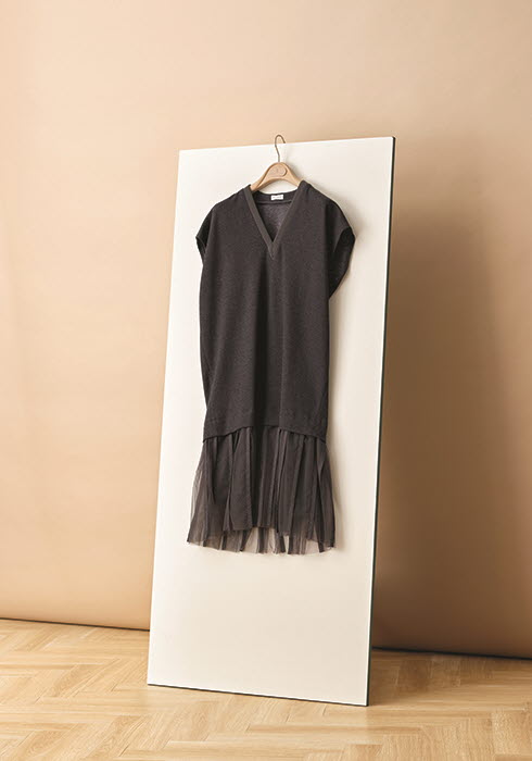 Brunello Cucinelli 캐주얼한 무드와 페미닌한 분위기가 공존하는 시폰 플리츠 디테일의 니트 드레스. 여름과 가을을 오가는 이맘때는 이 한 벌로도 충분하지만, 겨울에는 니트 풀오버를 이너로 입거나 가죽 레깅스 혹은 팬츠와 함께 다양한 레이어링 스타일을 연출할 수 있다. 울 저지 소재와 시폰 레이스가 어우러진 원피스 3백77만원 브루넬로 쿠치넬리. 문의 02-3448-2931 FABIANA FILIPPI