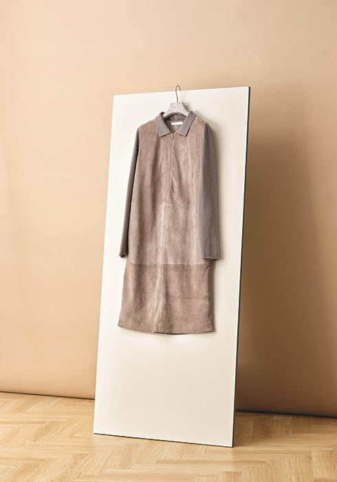 브랜드 특유의 차분한 컬러와 고급스러운 소재 사용이 인상 깊다. 스웨이드는 가죽과 함께하면 존재감이 더욱 부각되니, 이와 어울리는 슈즈를 고를 땐 멋스러운 레더 부츠를 선택할 것. 그레이와 베이지로 이어지는 담백한 색조에 니트와 스웨이드 소재를 레이어드한 원피스 2백58만원 파비아나 필리피. 문의 02-6960-0831