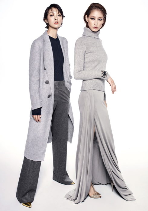 네이비 니트 톱, 연그레이 롱 코트, 그레이 와이드 팬츠 모두 셀린느. 골드 메탈 포인트의 레오퍼드 앵클 슈즈 마르니.