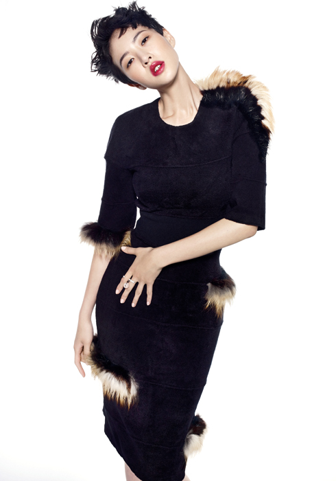 블랙 니트 톱, 블랙 가죽 원피스, 아이보리 롱 코트, 블랙 스트랩 가죽 샌들 모두 에르메스. 크리스털 이어커프, 원형 스톤 포인트 링 모두 미네타니.