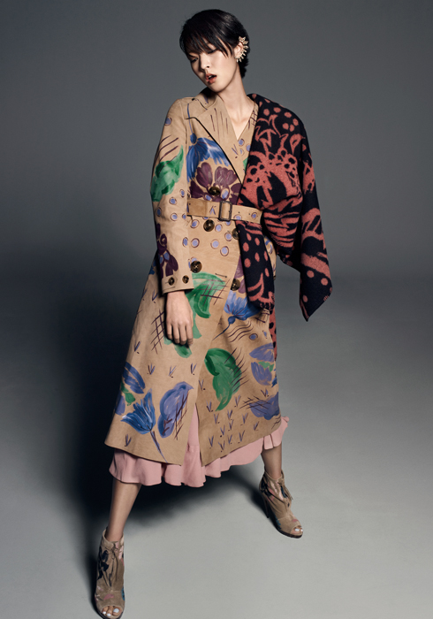 핸드 프린팅 패턴의 트렌치코트, 로즈 컬러 슬립 드레스 모두 버버리 프로섬. 핑크 패턴의 블랙 블랭킷 스카프, 핸드 페인팅 앵클부츠 모두 버버리. 골드 스터드 장식 이어커프 미네타니.