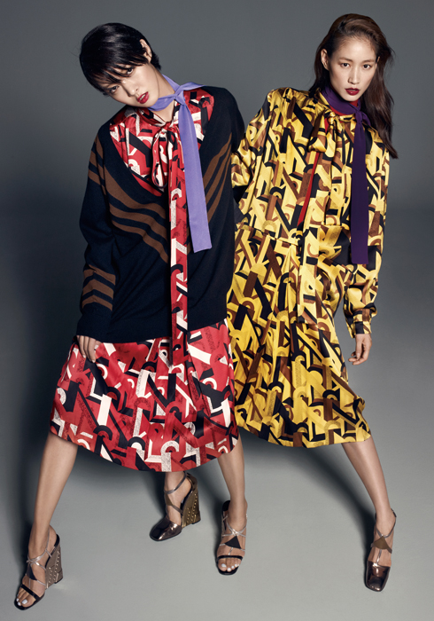 기하학적인 패턴의 옐로 실크 드레스, 레드 터틀넥 니트 톱, 퍼플 타이 스카프, 골드 웨지힐 슈즈 모두 프라다.