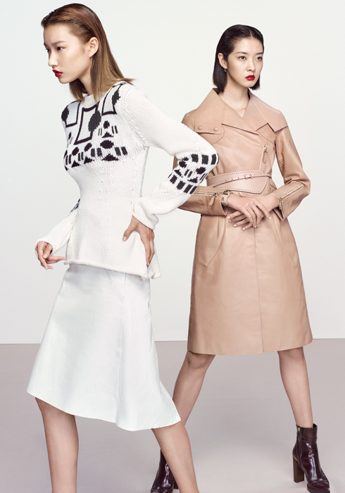 (왼쪽) 화이트 니트 톱, 화이트 레더 스커트 모두 토즈.(오른쪽) 베이지 레더 트렌치코트, 베이지 벨트, 핑크&골드 뱅글, 버건디 앵클부츠 모두 토즈.
