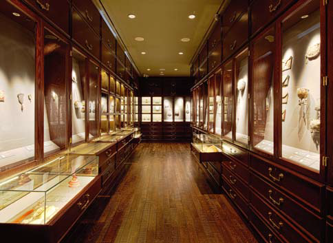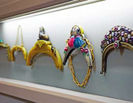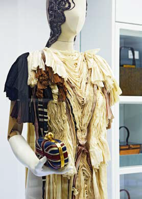 1핸드백 뮤지엄 3층 전시관 전경. 2 <이탈리아의 색깔> 특별 전시장 전경. 3 뮤지엄 복도에 핸드백과 관련된 소품들이 전시되어 있다. 4,6 4층 전시관에서는 빈티지 핸드백 컬렉션을 선보인다. 5 알렉산더 맥퀸의 유니온 잭 클러치를 강렬한 디테일의 의상을 입은 마네킹과 함께 전시했다. 전시장에 설치한 마네킹들도 오로지 핸드백 뮤지엄을 위해 특별 제작했다. 7, 8 현대적인 핸드백의 상징이라고 할 수 있는 에르메스의 악어가죽 버킨 백과 알렉산더 맥퀸의 유니온잭 클러치까지, 시대의 흐름을 보여주는 대표적인 세기의 핸드백들이 모두 전시되어 있다.