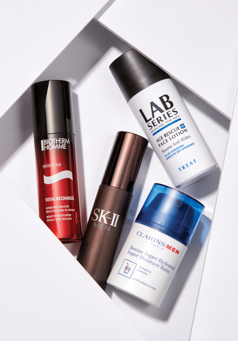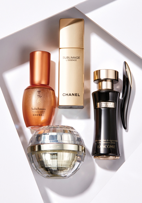 | Grooming item for man (오른쪽부터 시계 방향으로) 랩 시리즈 에이지 레스큐 + 훼이스 로션 강력한 인삼 추출물이 주름과 피로의 흔적을 지워주는 안티에이징 에센스. 50ml 6만5천원. 클라란스 맨 수퍼 모이스처 밤 면도 후 자극받은 피부를 진정시키고 수분을 공급한다. 50ml 5만1천원. SK-II MEN 페이셜 트리트먼트 에센스 독자적인 피테라™ 성분이 피부를 맑고 생기 넘치게 해준다. 75ml 9만원대. 비오템 옴므 토탈 리차지 에너지 부스터 모이스춰라이저 인삼 추출물, 카페인, 구아라나의 3중 에너지 복합체가 피부를 개선하는 에센스. 50ml 6만2천원대. | Premium beauty(가운데부터 시계 방향으로)샤넬 수블리마지 레쌍스 기존의 수블리마지 기능은 유지하고, 피부 독소 제거 기능을 더해 피부 광채를 실현하는 세럼. 30ml 51만원. 랑콤 얼티밋 뷰티파잉 미스트 로션 10주간 발효 과정을 마친 장미 줄기세포의 생명력을 담은 활성 미스트. 150ml 15만원대. 끌레드뽀 보떼 라 크렘므 탄생부터 각질층으로 올라올 때까지 세포의 일생을 프로듀스한다는 콘셉트로 탄생한 하이엔드 크림. 30ml 68만원. 설화수 자여진에센스 잔주름이 깊고 넓게 뻗어나가는 주름 줄기 현상을 공략한 안티에이징 에센스. 35ml 15만원대. |