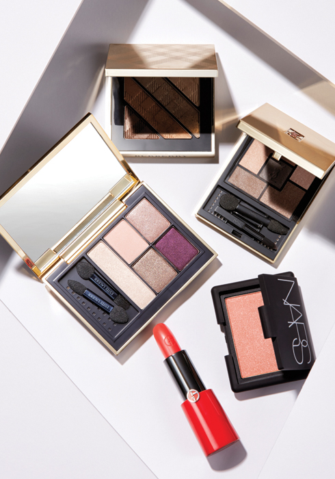 | Essential shades(가운데부터 시계 방향으로) 버버리 컴플리트 아이 팔레트 고밀도 입자로 이루어진 골드 팔레트. 5.4g 6만5천원. 입생로랑 꾸뛰르 팔레트 몬드리안 드레스에서 영감을 얻은 다섯 가지 컬러를 담은 아이섀도 팔레트. 5g 8만3천원대. 나스 블러쉬 언로플 어떤 피부 톤에나 건강한 혈색이 돌게 하는 블러셔. 4.8g 3만9천원. 조르지오 아르마니 루즈 액스터시 빈틈없는 완벽한 레드 립을 만드는 립스틱. 4g 3만9천원. 에스티 로더 퓨어 칼라 엔비 스컬프팅 아이섀도우 팔레트 베이스부터 중간 톤, 포인트 컬러까지 담아 그윽한 아이 메이크업을 완성한다. 7g 7만원대. | Alluring scent(가운데부터 시계 방향으로) 앳킨슨 24 올드 본드 스트리트 오드코롱 2백 년 이상의 역사를 이어온 영국의 대표적인 니치 향수 브랜드 앳킨슨의 상쾌한 향수. 50ml 13만5천원. 보테가 베네타 놋 오드 퍼퓸 만다린, 라임 열매, 네롤리의 상쾌한 톱 노트와 머스크, 통카 빈의 베이스 노트가 어우러진 이국적인 향수. 50ml 15만원. 조 말론 런던 피오니 앤 블러쉬 스웨이드 화려하게 핀 작약과 붉은 사과, 재스민이 부드러운 관능미를 선사하는 향수. 30ml 8만4천원대. 존 바바토스 빈티지 EDT 클래식한 남자를 위한 매력적인 향수 75ml 8만2천원. |