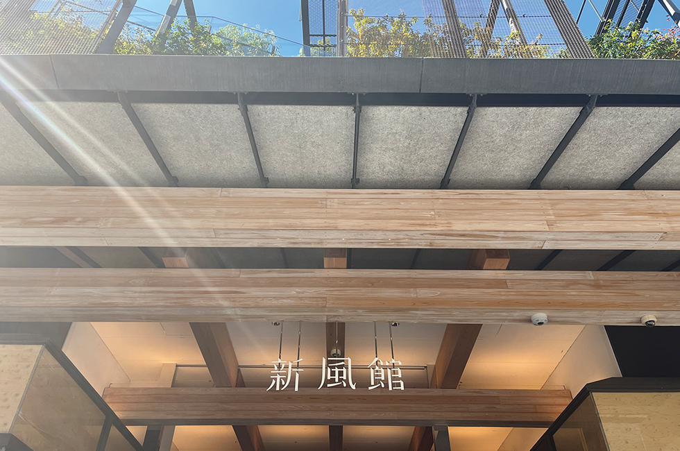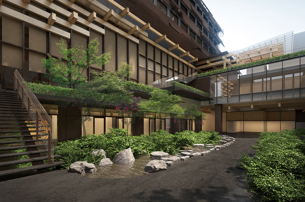 1 2020년 문을 연 에이스 호텔 교토 건물의 안뜰. 교토의 유서 깊은 건물인 복합 컴플렉스 신풍관과 이어져 있는 건물로 스타 건축가 구마 겐고(Kengo Kuma)가 전반적인 리뉴얼 설계 작업과 인테리어 디자인을 총괄했다.