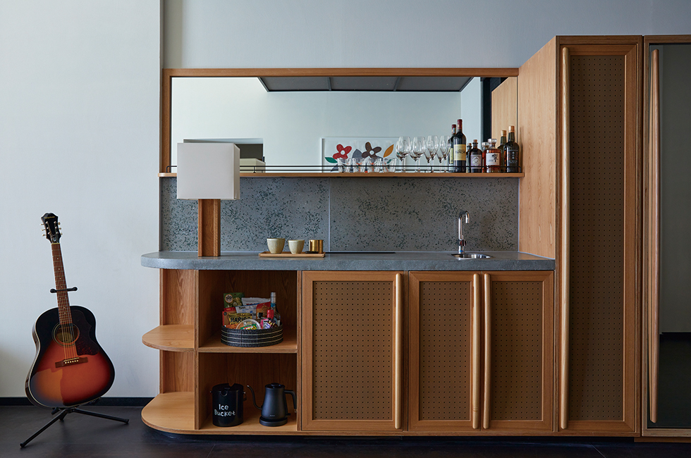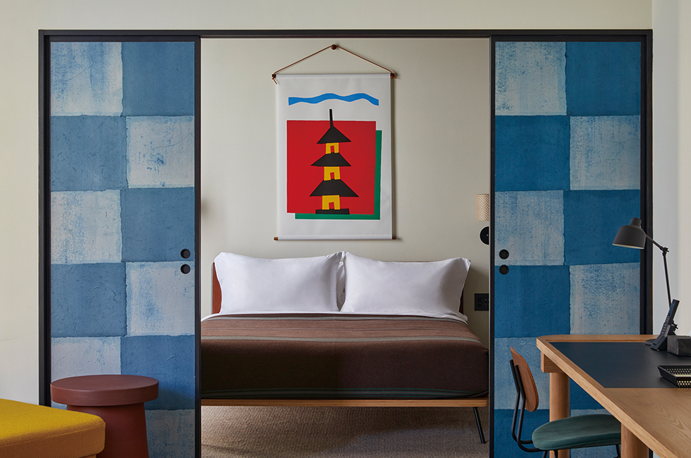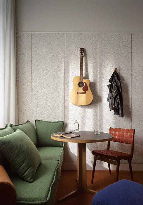 4, 5 에이스 호텔 교토의 섬세한 안락함과 귀여운 생기가 느껴지는 객실 모습. LP 플레이어가 있다든지, 전용 디자인 굿즈를 활용하고 구매할 수 있다든지 하는 식으로 디자인과 음악 같은 문화 예술적 요소를 담은 에이스 호텔의 특장점이 거실에서도 잘 드러난다.