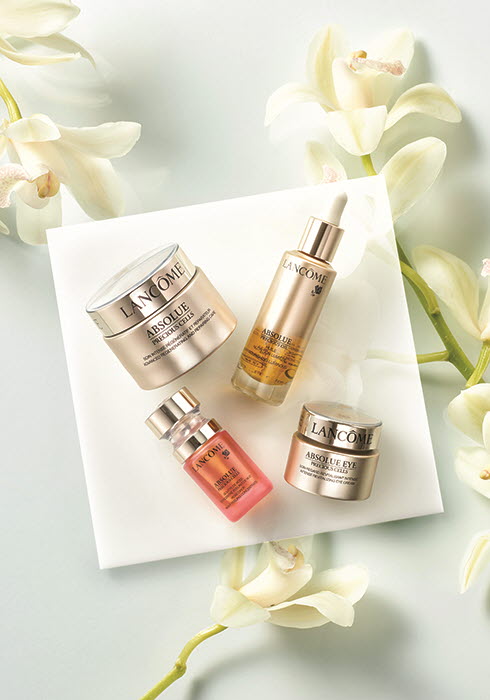 (왼쪽부터 시계 방향으로) 기존 압솔뤼 프레셔스 셀 제품에 놀라운 재생력을 발휘하는 사과 줄기세포를 더해 새롭게 선보이는 ‘압솔뤼 프레셔스 셀 50ml 37만원, 로션과 세럼 사이에 사용하면 눈부신 광채를 선사하는 압솔뤼 다마스크 로즈 오일 30ml 25만원, 압솔뤼의 핵심 성분인 프록-실린이 눈가 피부를 더욱 촘촘하게 당겨주는 압솔뤼 프레셔스 셀 아이크림 20ml 21만원, 세 가지 장미 추출물을 담은 저자극 필링 제품 압솔뤼 로즈 필링 드롭 15ml 17만5천원 모두 랑콤. 문의 080-001-9500