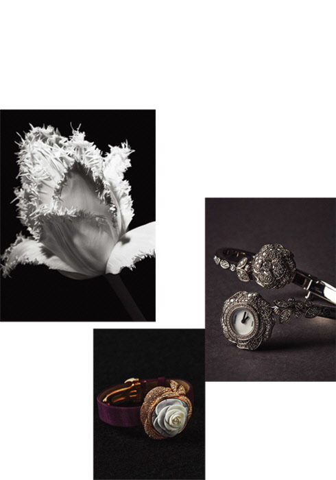 입체적으로 조각한 정교한 장미 꽃잎 모티브 커버를 옆으로 살짝 밀면 다이아몬드를 파베 세팅한 로즈 골드 다이얼이 드러나는 하이 주얼리 타임피스 ‘시크릿 드 라 레인’ 2천6백만원대 브레게.