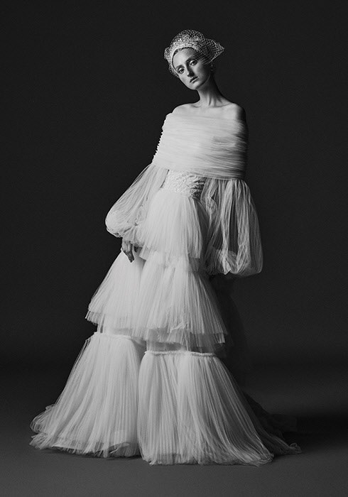 스커트를 겹겹이 레이어드한 오프숄더 티어드 드레스 7백만원대 아이리스 노블 by 메종 레브.